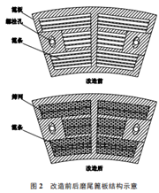 上述解决出料篦板堵塞的措施只能起到缓解出料篦板的堵塞、延长出料篦板的清理周期的作用,不能从根本上彻底解决问题。因此,还需对球磨机出料篦板的结构进行改造。通过利用现有材料自制防堵塞篦板,降低堵塞影响,增大磨尾通风面积,解决饱磨问题。改造前后磨尾篦板结构示意见图2。