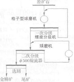 通过对当时生产工艺流程的考察与计算,发现制约提高生产处理能力的瓶颈主要在磨矿和选别作业。破碎和脱水只须作适当调整即可满足改造后的工艺需求。